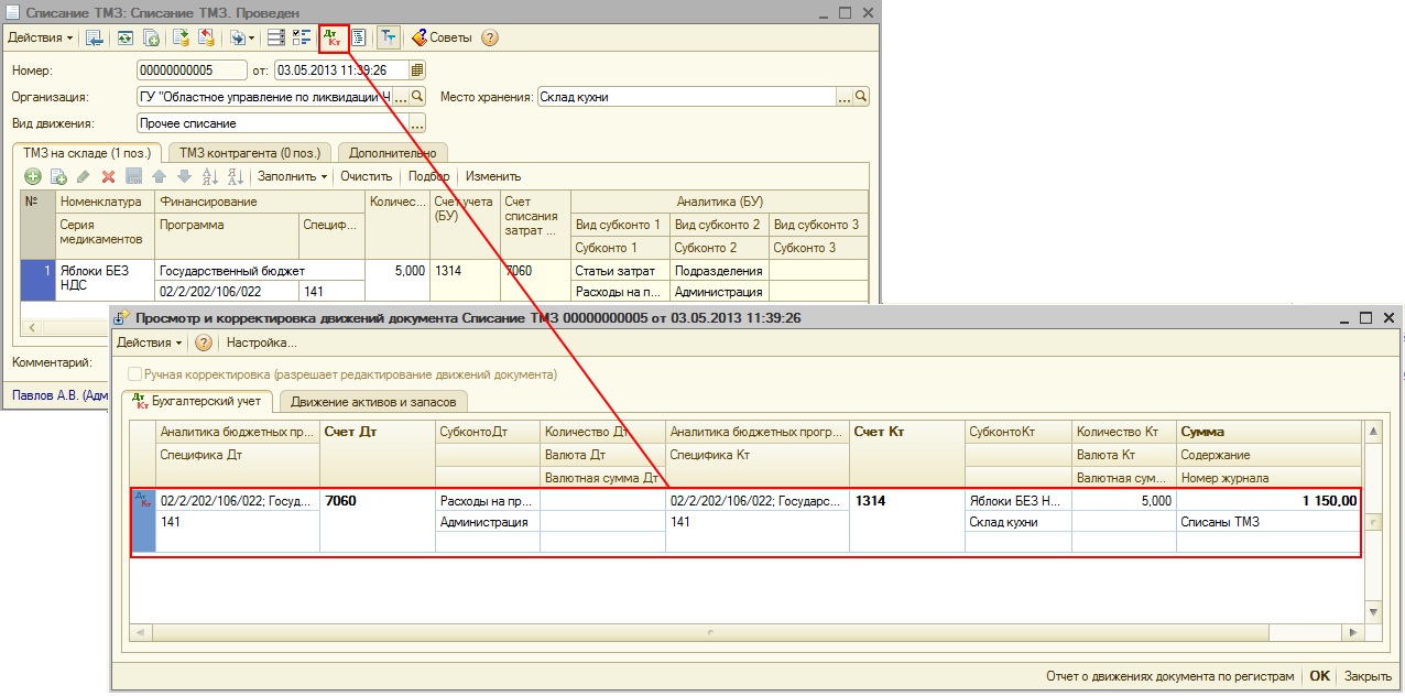 Если же списывается 5 кг номенклатуры «Яблоки БЕЗ НДС», то затраты по специфике 168 не возникнут так как сумма НДС в этом случае будет равна нулю и, следовательно, дополнительная проводка на сумму затрат по специфике 168 при списании сформирована не будет.