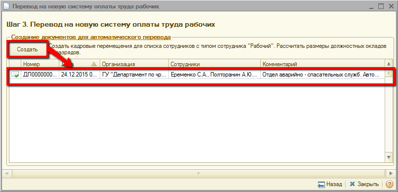 В табличной части «Создание документов для автоматического перевода» по нажатию кнопки «Создать» создаются документы кадровых перемещений организаций с комментарием «Автоматический перевод на новую систему оплаты труда рабочих».