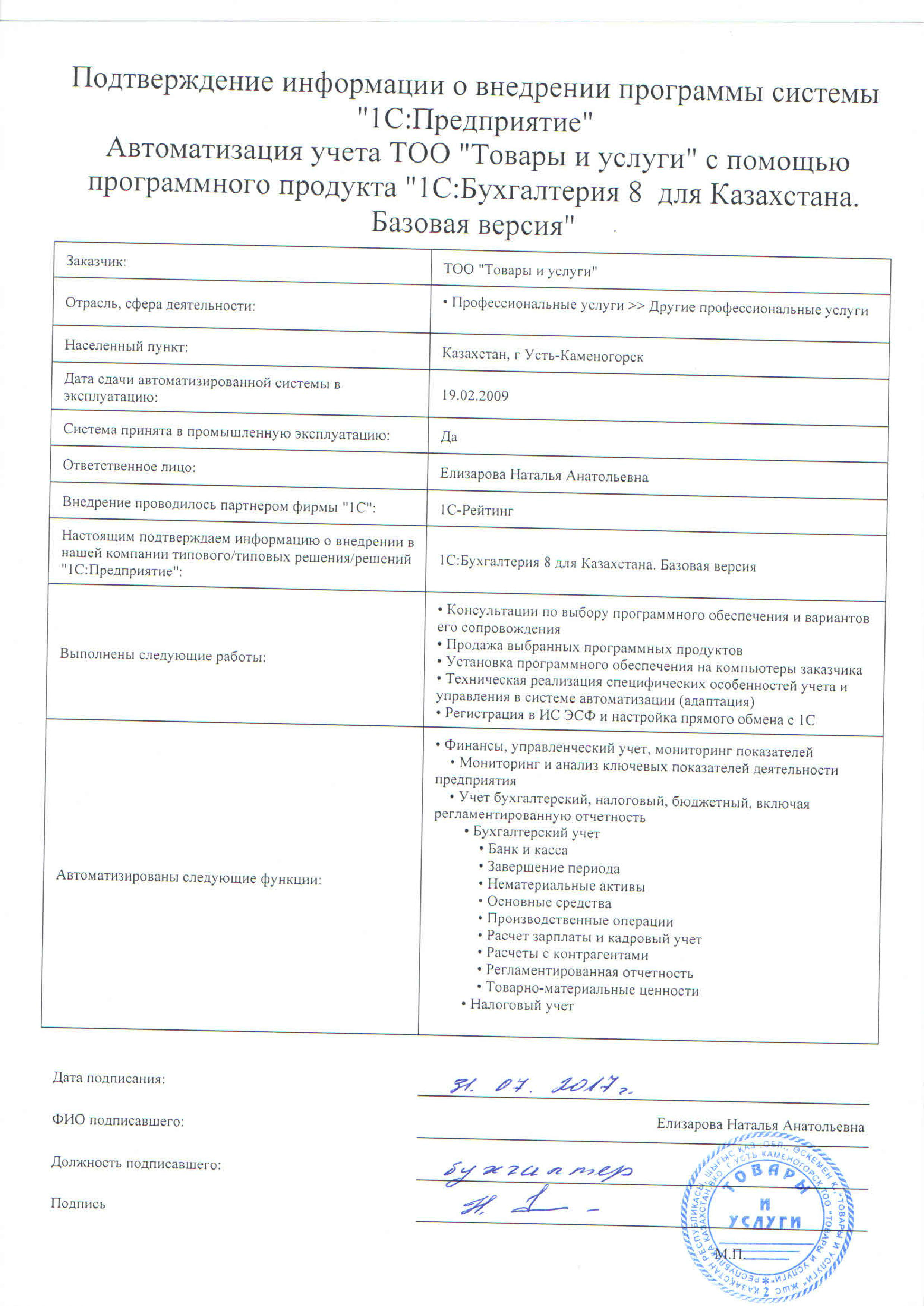 ТОО «Товары и Услуги»