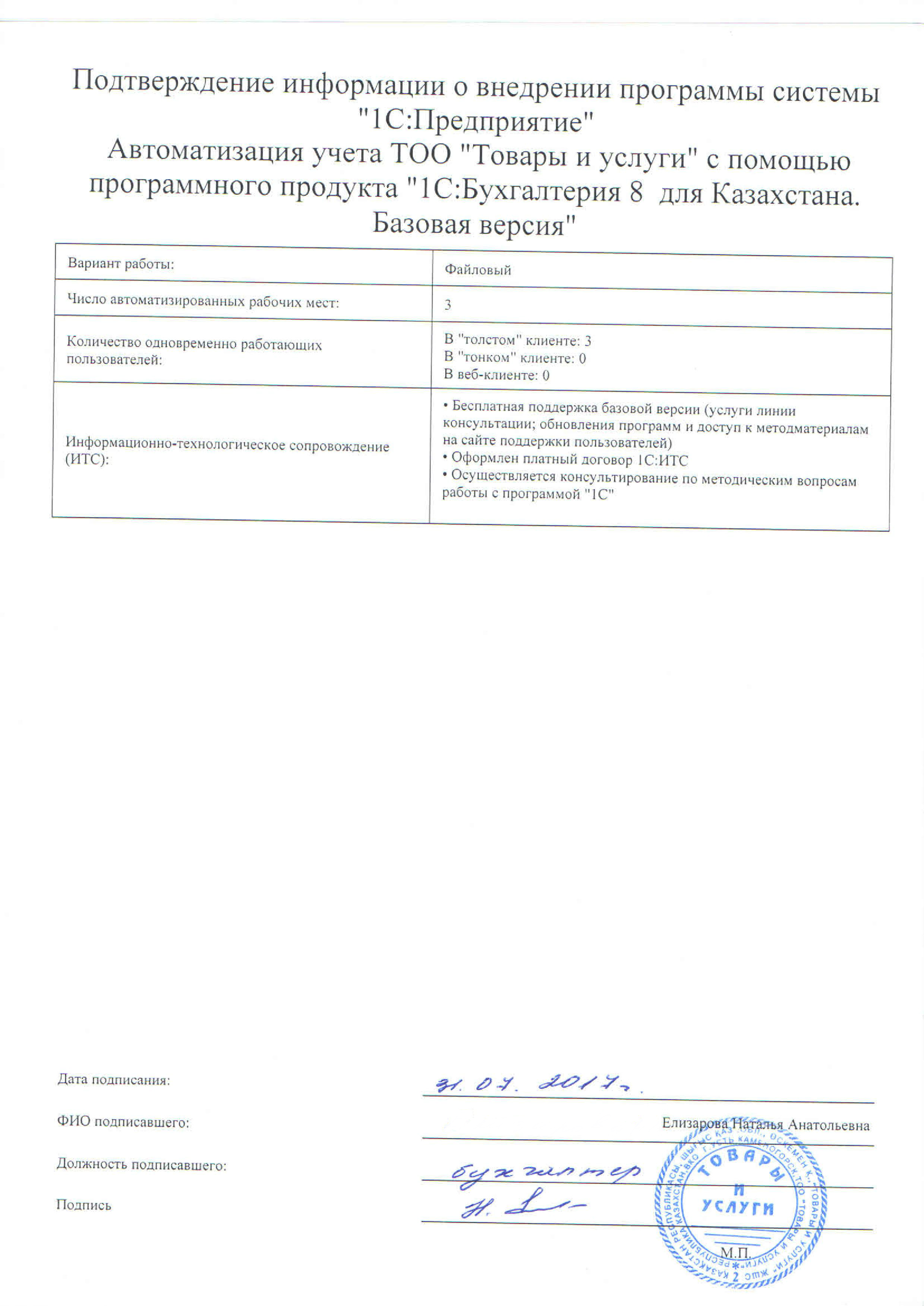 - Оформлен платный договор 1С:ИТС