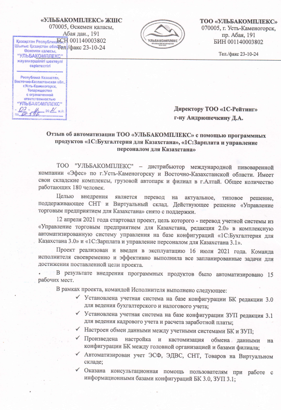 12 апреля 2021 года стартовал проект, цель которого - перевод учетной системы из «Управление торговым предприятием для Казахстана, редакция 2.0» в комплексную автоматизированную систему управления на базе конфигураций «1С:Бухгалтерия для Казахстана 3.0» и «1С:Зарплата и управление персоналом для Казахстана 3.1».