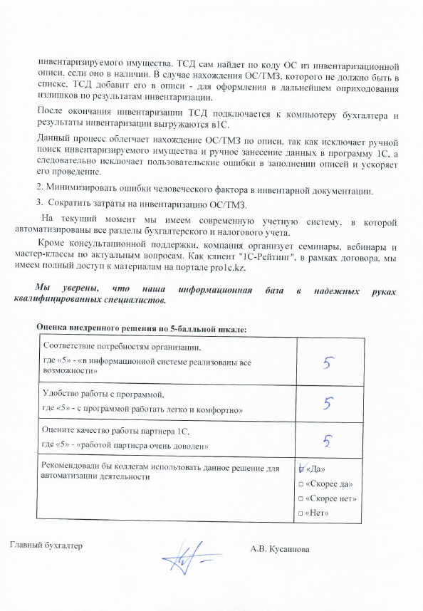 - Сократилось время проведения инвентаризации с одного месяца до двух недель. Документы инвентаризации подготавливаются в 1С и выгружаются на ТСД путем нажатия кнопки. Далее необходимо отключить ТСД от компьютера и просканировать штрих коды инвентаризуемого имущества. ТСД сам найдет по коду ОС из инвентаризационной описи. В случае нахождения номера ОС/ТМЗ, который не числится в списке, ТСД добавит его в опись для оформления в дальнейшем оприходования излишков по результатам инвентаризации. После окончания инвентаризации ТСД подключается к компьютеру бухгалтера и результаты инвентаризации выгружаются в 1С. Данный процесс облегчает нахождение ОС/ТМЗ по описи, так как исключает ручной поиск инвентаризуемого имущества и ручное занесение данных в программу 1С, а следовательно, исключает пользовательские ошибки в заполнении описей и ускоряет его проведение.