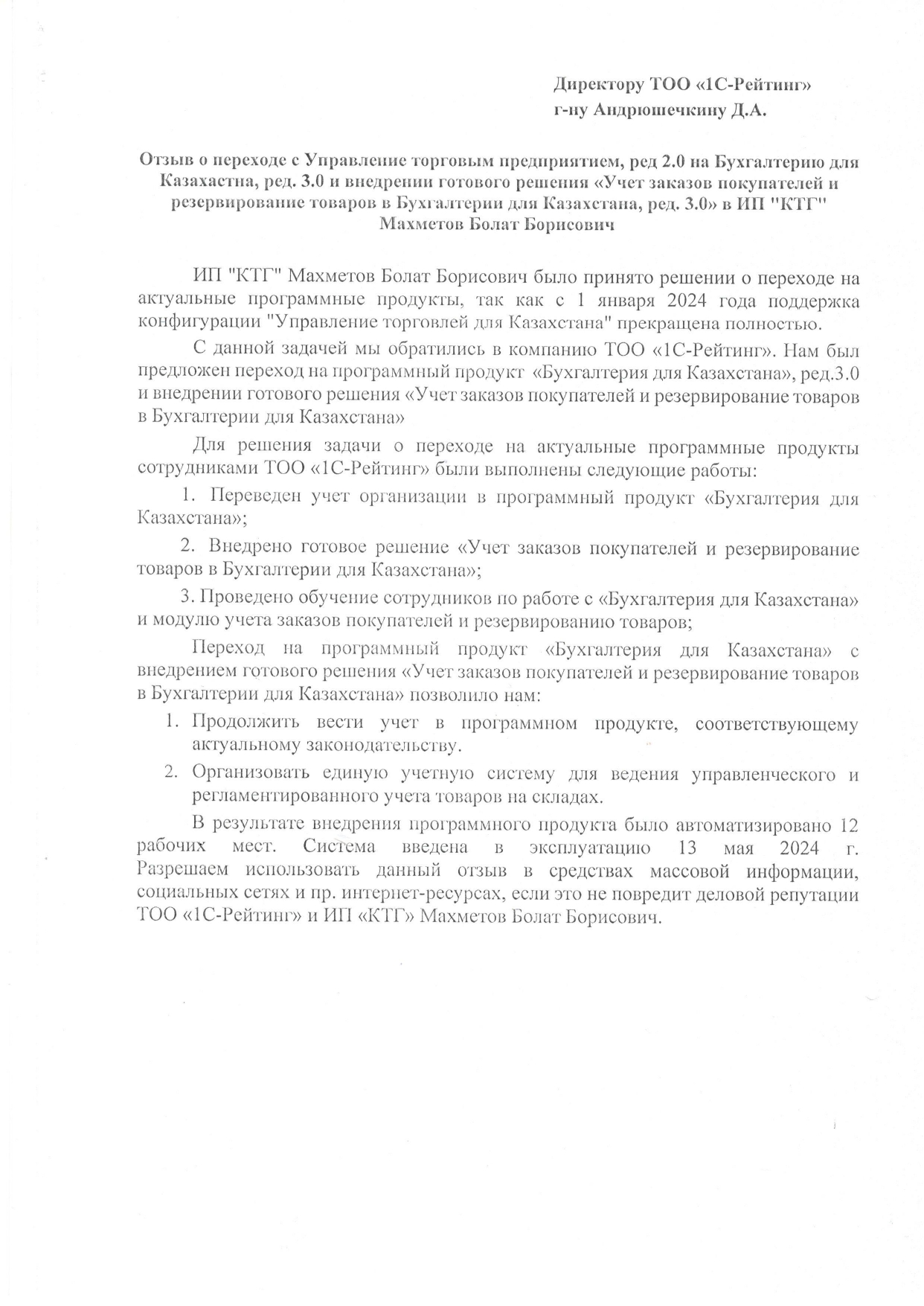 - Проведено обучение сотрудников по работе с «Бухгалтерия для Казахстана» и модулю учета заказов покупателей и резервированию товаров