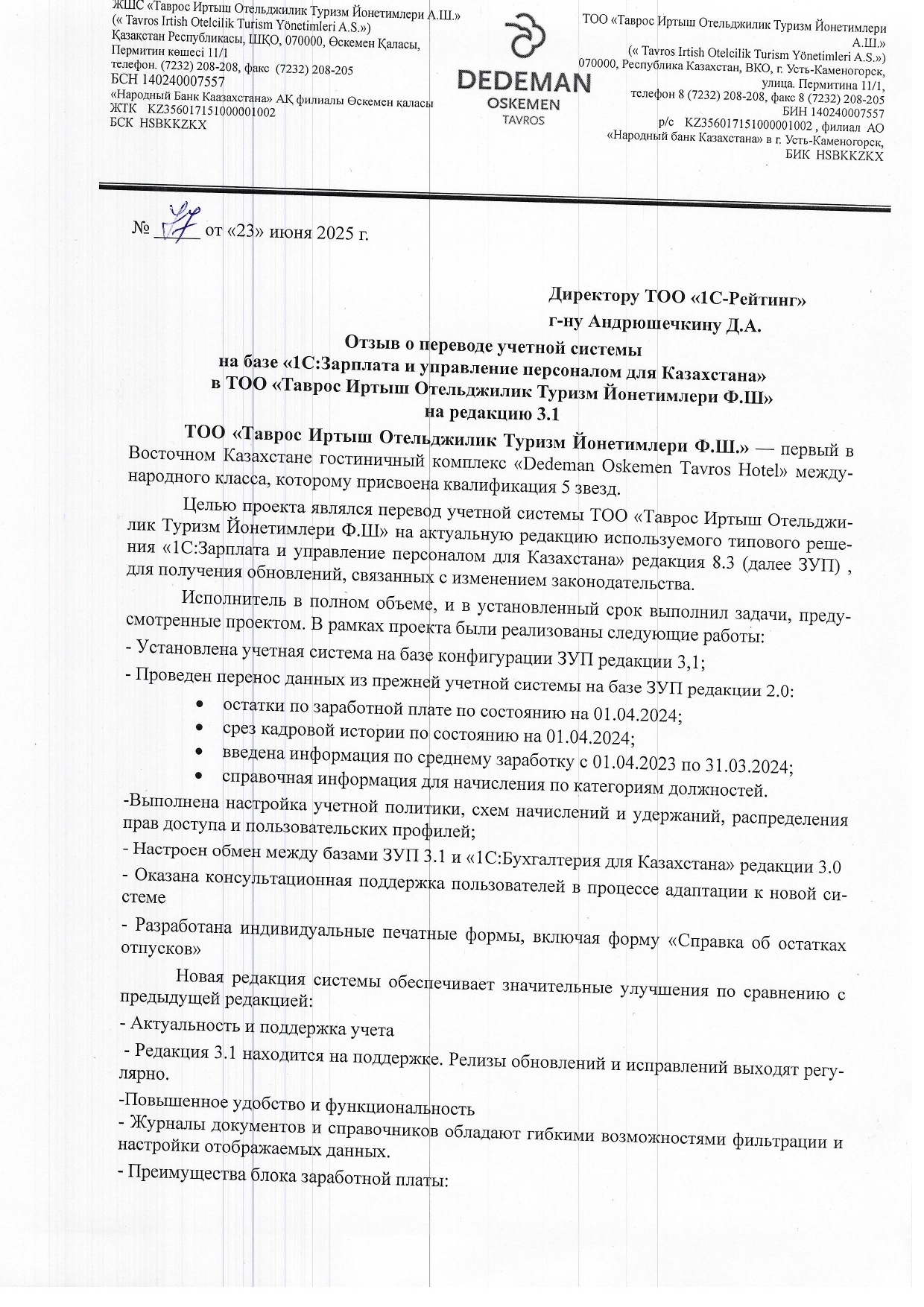 Благодаря проведённым работам, учетная система ТОО «Таврос Иртыш Отельджилик Туризм Йонетимлери Ф.Ш.» стала более современной, надёжной и адаптированной под актуальные требования бизнеса и законодательства.