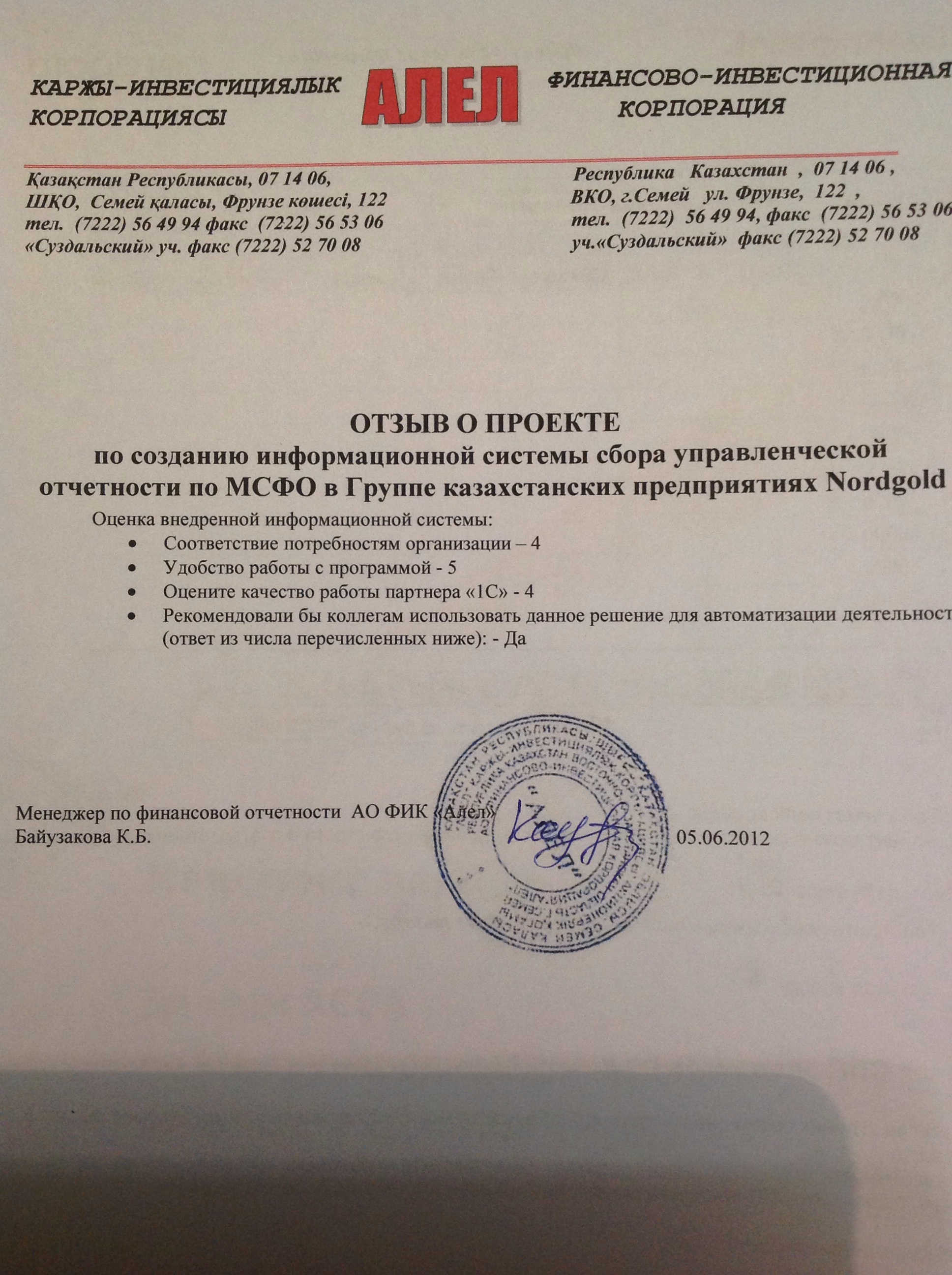 Руководитель проекта со стороны Заказчика Байузакова Куралай Байузаковна, менеджер по финансовой отчетности отметила следующие основные результаты проекта:
