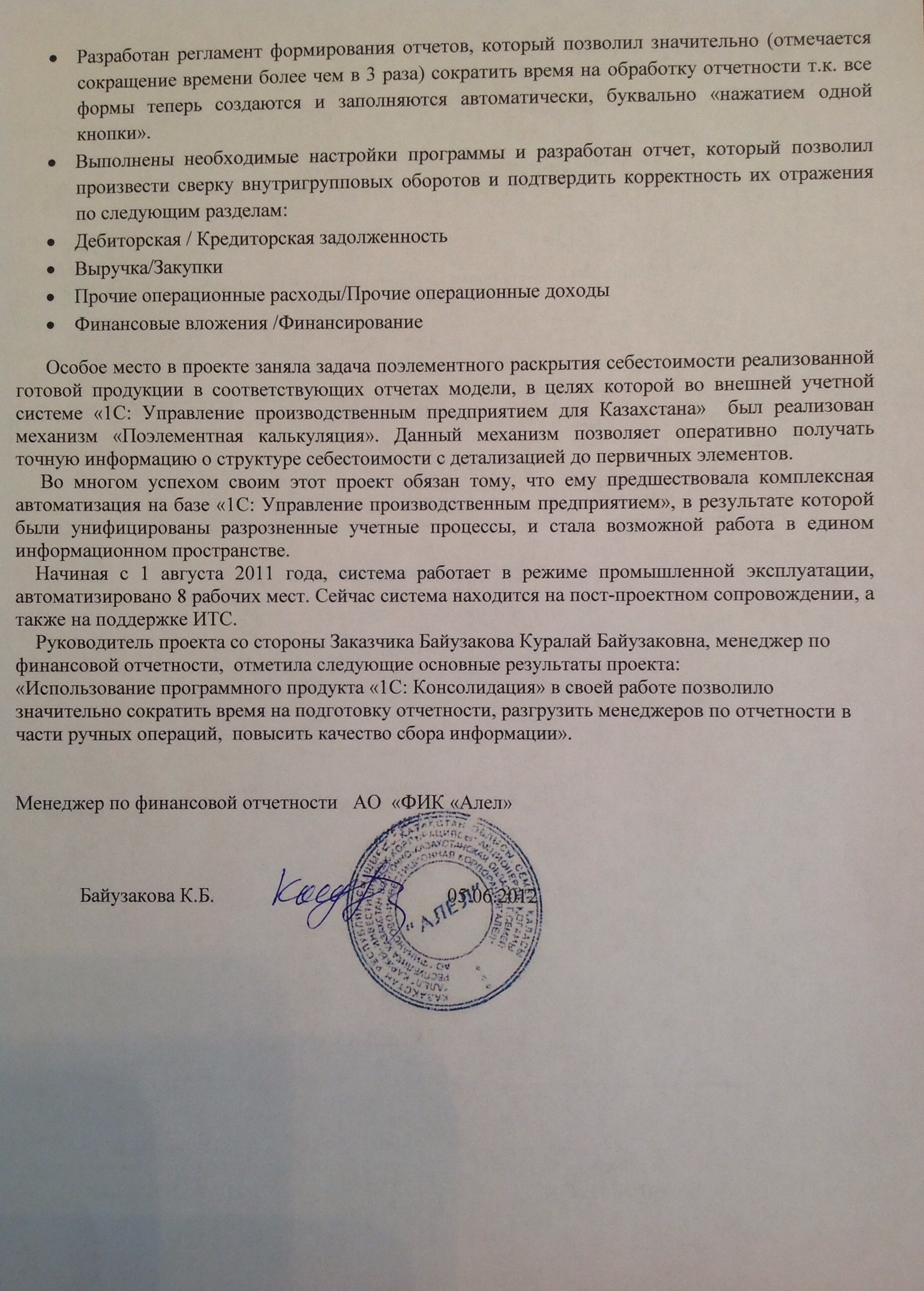 Учитывая потребность в оперативном предоставлении заполненных форм, а также в глубоком раскрытии информации в отчетности, руководством Группы казахстанских предприятий был инициирован проект автоматизации с использованием программного продукта «1С:Консолидация», целью которого было максимально упростить труд менеджеров по отчетности в части рутинного сбора и заполнения данных. В качестве партнера для реализации проекта была привлечена компания «1С-Рейтинг», с которой имелся успешный опыт сотрудничества на внедрении комплексной информационной системы на базе «1С:Управление производственным предприятием для Казахстана» (руководитель проекта со стороны Заказчика Равба Максим Николаевич).