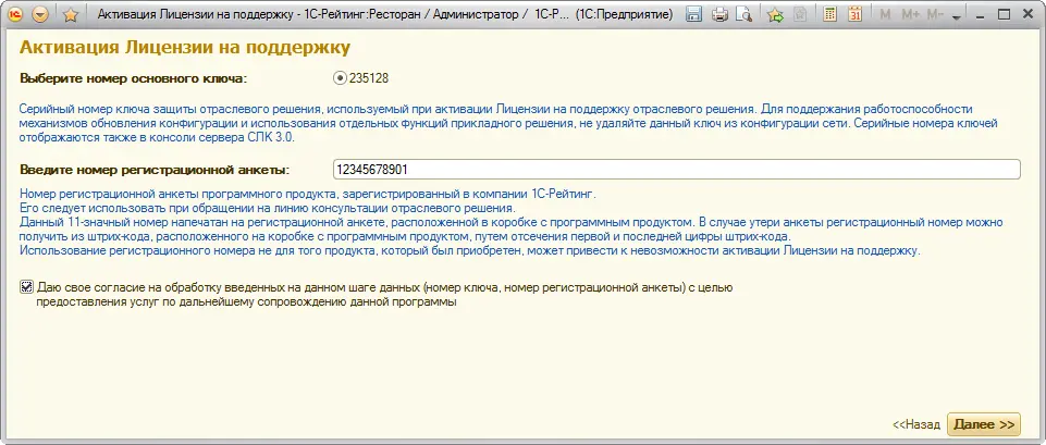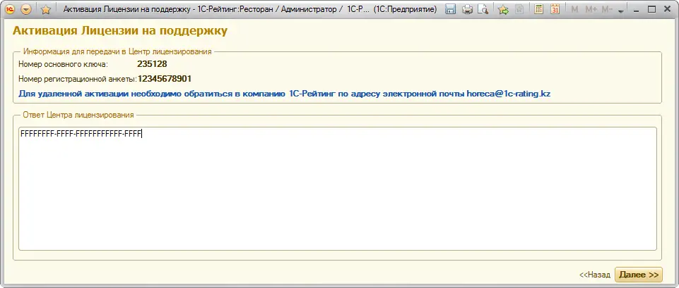 Номер основного ключа и номер регистрационной анкеты передаются в Центр лицензирования для выполнения активации.