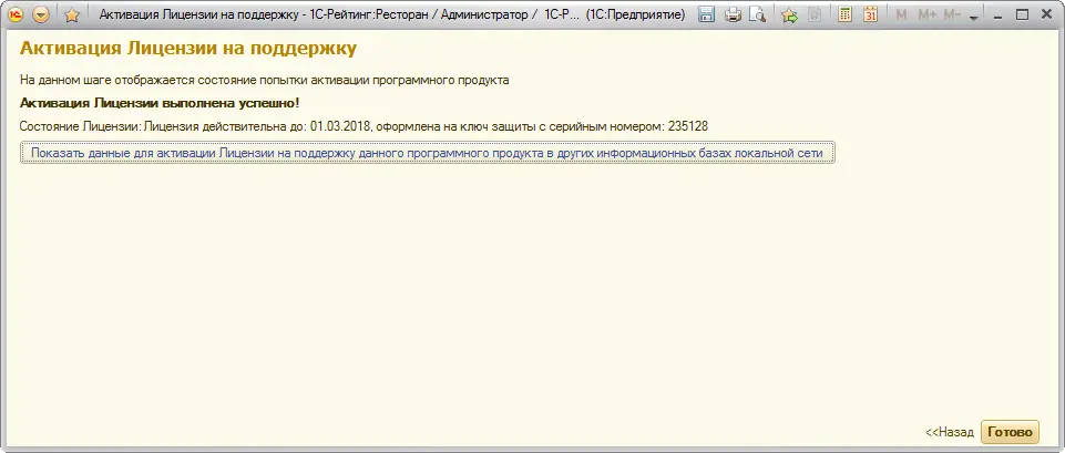 Если требуется активация в других информационных базах этого же программного продукта в пределах одной локальной сети, на странице результатов активации необходимо нажать кнопку «Показать данные для активации Лицензии на поддержку данного программного продукта в других информационных базах локальной сети» и скопировать выведенный в окне текст для вставки в другие информационные базы этого продукта в локальной сети.